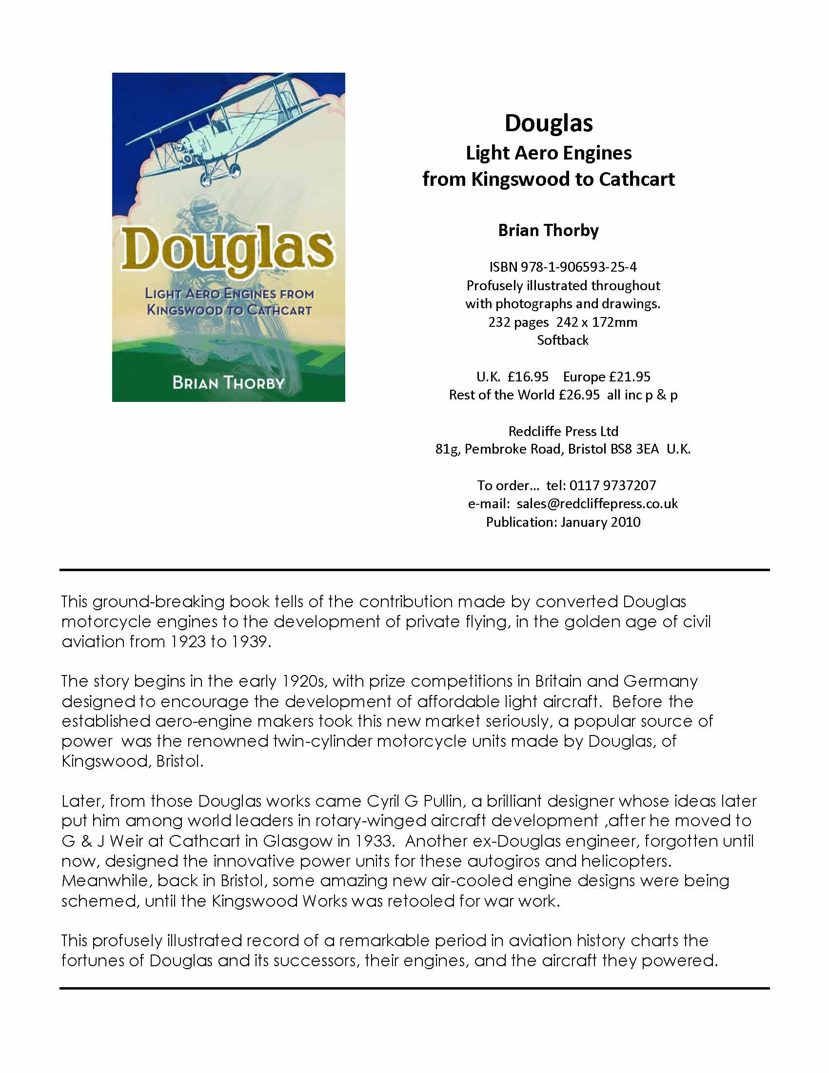 I've had and read my copy; twice. I think even the dedicated Douglas motorcycle enthusiast will be quite surprised by the number of aero engine models built at Kingswood or derived from ties to the factory. Even more so than than the unacquainted aviation enthusiast, who would be unaware of Douglas' sometimes precarious financial situation. Up to 1935 the motorcycle models that influenced the offerings are quite obvious. After that the engines became more purpose built, especially those C.G. Pullin went on to design for J.G. Weir in Scotland. It is amazing, with money so tight, just what the factory got up to, even at one point in the later thirties building the entire airframe for light aeroplanes!  Like the industrial motors (but more exciting) this is a whole other aspect of our favorite marque that everyone has heard a little about, but never the whole story. You will find this book fills a significant gap in the standard Douglas history, The Best Twin. From the mid-thirties till the Second World War, one would have got the impression from previous Douglas histories that the Works was in hibernation by the way they breeze over it to get to the postwar models. But in fact quite a lot of activity was going on, as this book now shows. Unfortunately none of the aviation activities helped the bottom line, and the pending war killed the light aviation market.