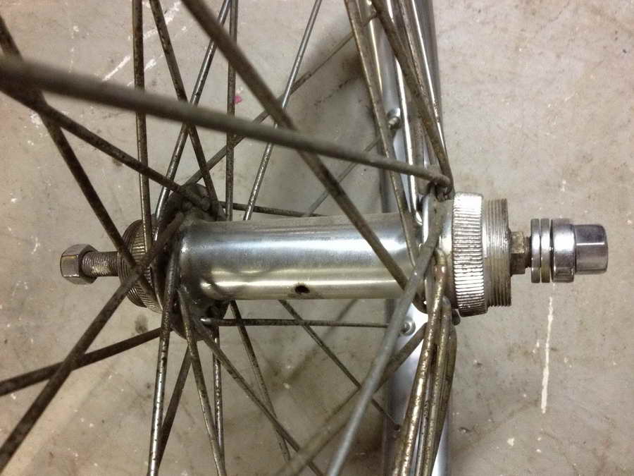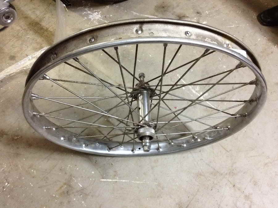 Speedway rear wheel to swop for 1925/26 CW wheel in similar condition. Note that the hub has provision for reversing the wheel once tyre is worn on one side so the hub has two sprocket mounts.