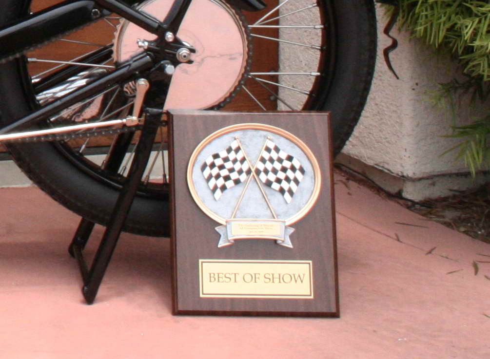 Thanks for sending in the photo. The bike is looking good. I added a couple of close-ups but couldn't read the fine inscription on the award. Where is it from?